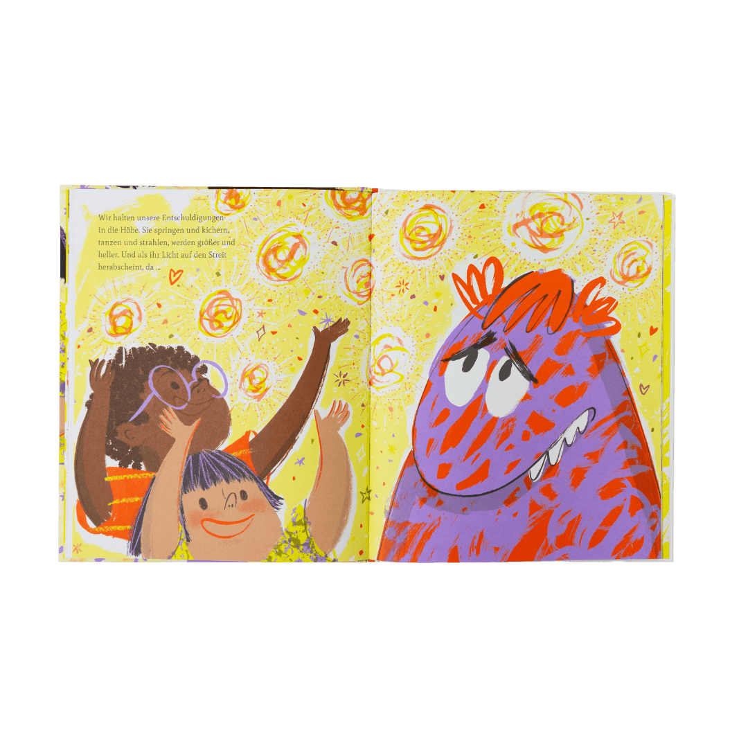 Joseph Coelho erzählt die Geschichte von zwei besten Freund*innen, deren Tag plötzlich von einem großen, frechen Streitmonster gestört wird. Das Monster wird immer größer und größer und entfernt die beiden immer weiter voneinander, bis irgendwann alle Kinder auf dem Spielplatz richtig mies drauf sind. Und jetzt? Da hilft nur eins – eine kleine zaghafte Entschuldigung, mit der die Kinder das Monster gemeinsam wieder zum Schrumpfen bringen, bis es irgendwann ganz verschwindet.
