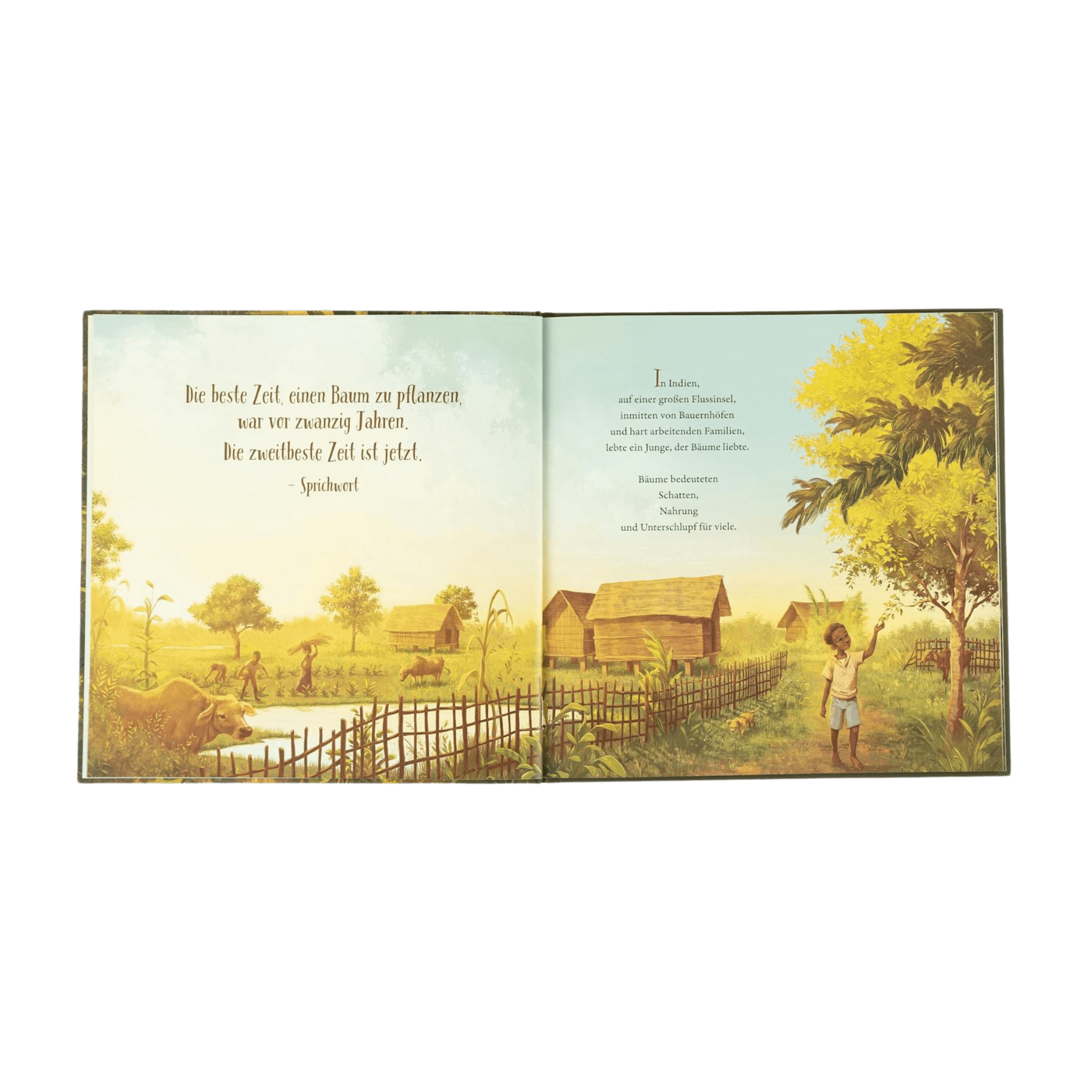 Eine illustrierte Doppelseite aus "Der Junge, der einen Wald pflanzte" von Sophia Gholz zeigt eine ländliche Szene mit Kindern, Arbeitern, strohgedeckten Häusern, Bäumen und Tieren. Auf der linken Seite steht ein Sprichwort über Bäume, auf der rechten ein kurzer Text über Regenwald.